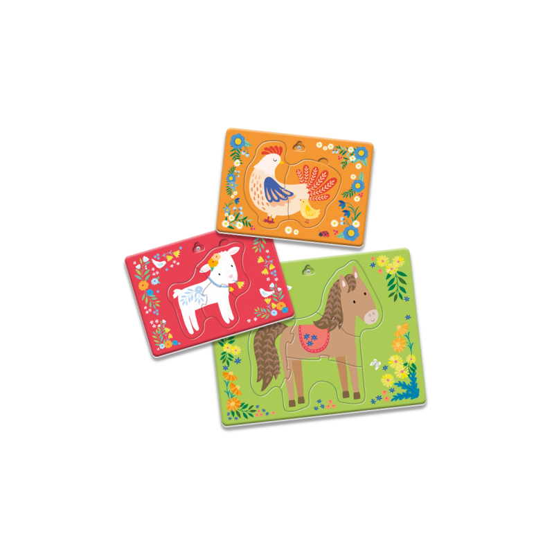 Tres puzzles perfilados para los más pequeños, con dificultad progresiva y una base especial para guiar al niño en sus primeros juegos de composición de la imagen. Las tres bases-guía, delicadamente ilustradas, ¡pueden convertirse en pequeños cuadros para colgar y decorar la habitación del niño!